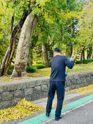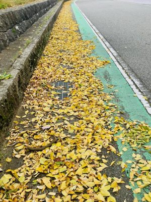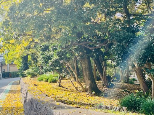 高坂公園の黄葉、落ち葉がピークを迎えています。