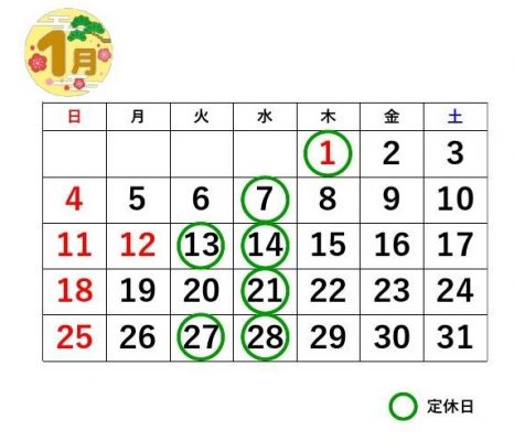 1月は1日(木)もお休みをいただきます。