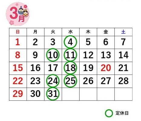 3月は第2・4・5火曜と毎週水曜が定休日です。